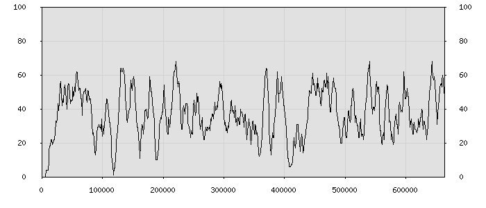 (по горизонтали: счётчик знаков; по вертикали: процент диалогов; размер скользящего окна: знаков, шаг: 1000 знаков) |