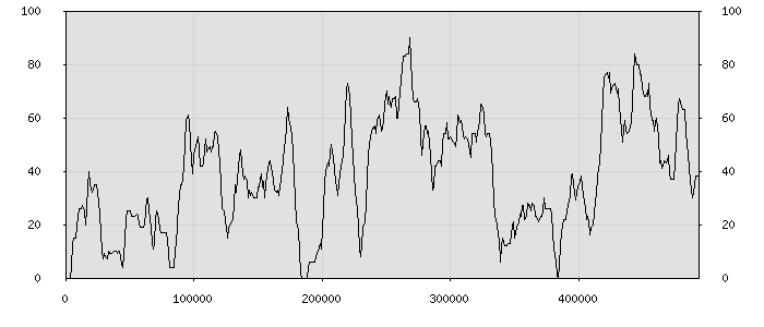 (по горизонтали: счётчик знаков; по вертикали: процент диалогов; размер скользящего окна: знаков, шаг: 1000 знаков) |