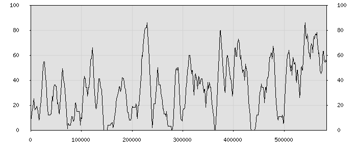 (по горизонтали: счётчик знаков; по вертикали: процент диалогов; размер скользящего окна: знаков, шаг: 1000 знаков) |