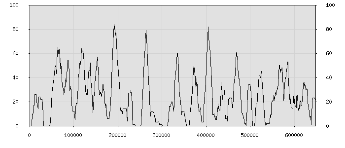 (по горизонтали: счётчик знаков; по вертикали: процент диалогов; размер скользящего окна: знаков, шаг: 1000 знаков) |