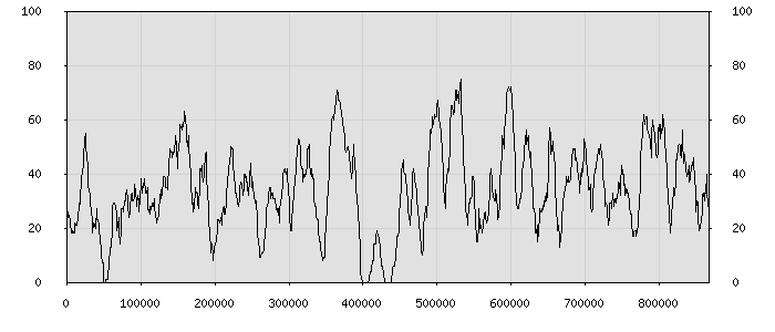 (по горизонтали: счётчик знаков; по вертикали: процент диалогов; размер скользящего окна: знаков, шаг: 1000 знаков) |