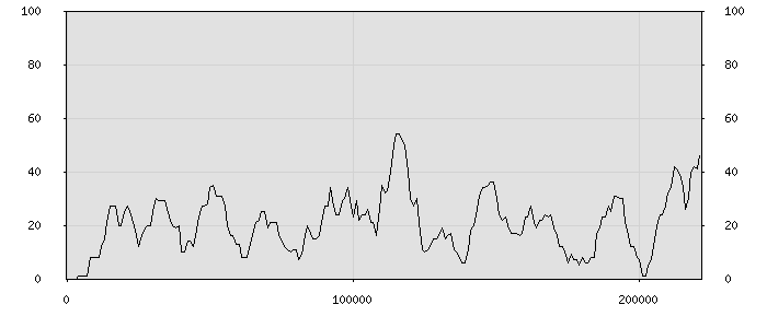 (по горизонтали: счётчик знаков; по вертикали: процент диалогов; размер скользящего окна: знаков, шаг: 1000 знаков) |