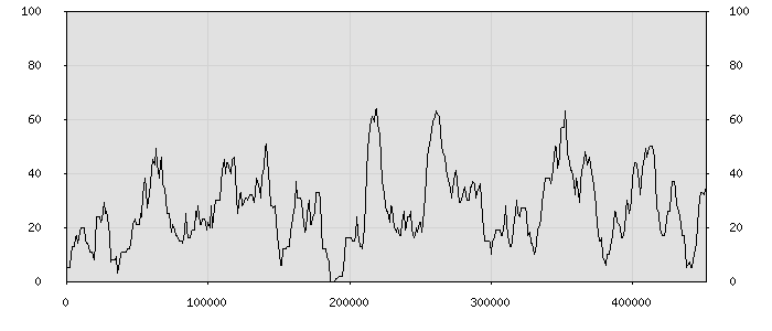 (по горизонтали: счётчик знаков; по вертикали: процент диалогов; размер скользящего окна: знаков, шаг: 1000 знаков) |