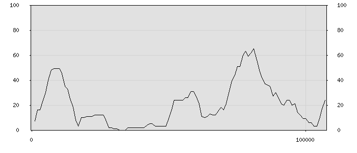 (по горизонтали: счётчик знаков; по вертикали: процент диалогов; размер скользящего окна: знаков, шаг: 1000 знаков) |