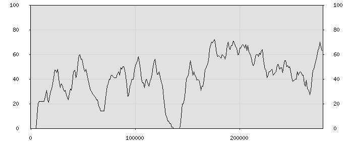 (по горизонтали: счётчик знаков; по вертикали: процент диалогов; размер скользящего окна: знаков, шаг: 1000 знаков) |