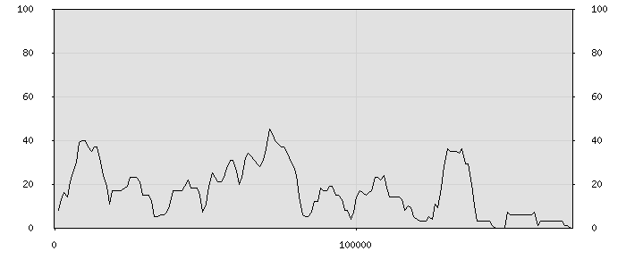 (по горизонтали: счётчик знаков; по вертикали: процент диалогов; размер скользящего окна: знаков, шаг: 1000 знаков) |