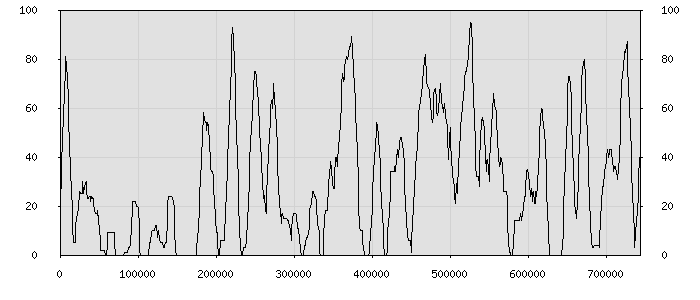 (по горизонтали: счётчик знаков; по вертикали: процент диалогов; размер скользящего окна: знаков, шаг: 1000 знаков) |