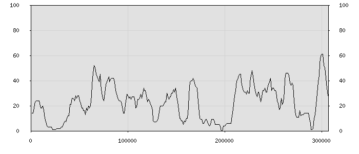 (по горизонтали: счётчик знаков; по вертикали: процент диалогов; размер скользящего окна: знаков, шаг: 1000 знаков) |