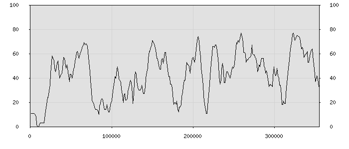 (по горизонтали: счётчик знаков; по вертикали: процент диалогов; размер скользящего окна: знаков, шаг: 1000 знаков) |