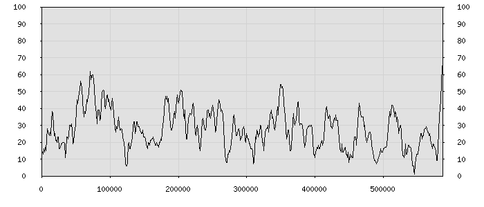 (по горизонтали: счётчик знаков; по вертикали: процент диалогов; размер скользящего окна: знаков, шаг: 1000 знаков) |