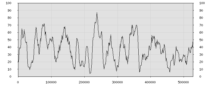 (по горизонтали: счётчик знаков; по вертикали: процент диалогов; размер скользящего окна: знаков, шаг: 1000 знаков) |