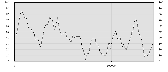 (по горизонтали: счётчик знаков; по вертикали: процент диалогов; размер скользящего окна: знаков, шаг: 1000 знаков) |