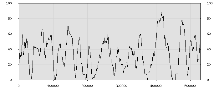 (по горизонтали: счётчик знаков; по вертикали: процент диалогов; размер скользящего окна: знаков, шаг: 1000 знаков) |