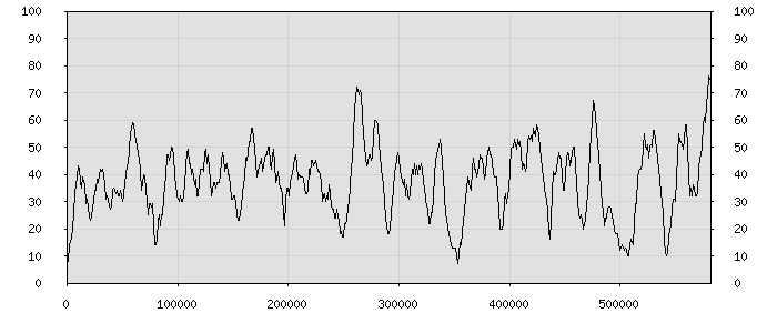 (по горизонтали: счётчик знаков; по вертикали: процент диалогов; размер скользящего окна: знаков, шаг: 1000 знаков) |