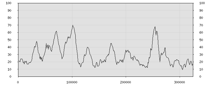 (по горизонтали: счётчик знаков; по вертикали: процент диалогов; размер скользящего окна: знаков, шаг: 1000 знаков) |