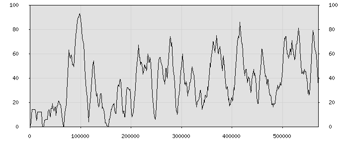(по горизонтали: счётчик знаков; по вертикали: процент диалогов; размер скользящего окна: знаков, шаг: 1000 знаков) |