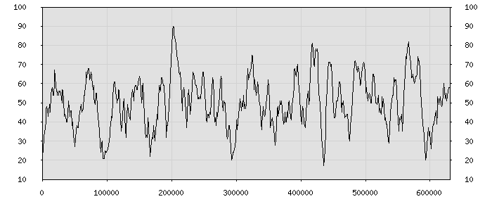(по горизонтали: счётчик знаков; по вертикали: процент диалогов; размер скользящего окна: знаков, шаг: 1000 знаков) |