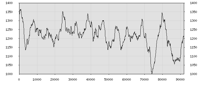 (по горизонтали: счётчик знаков; по вертикали: процент диалогов; размер скользящего окна: знаков, шаг: 1000 знаков) |