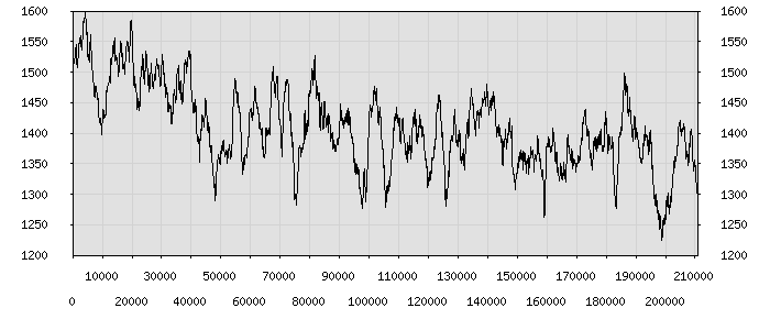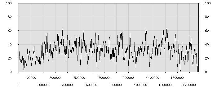 (по горизонтали: счётчик знаков; по вертикали: процент диалогов; размер скользящего окна: знаков, шаг: 1000 знаков) |