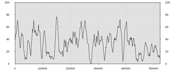 (по горизонтали: счётчик знаков; по вертикали: процент диалогов; размер скользящего окна: знаков, шаг: 1000 знаков) |
