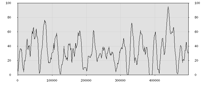 (по горизонтали: счётчик знаков; по вертикали: процент диалогов; размер скользящего окна: знаков, шаг: 1000 знаков) |