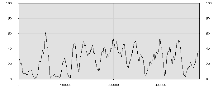 (по горизонтали: счётчик знаков; по вертикали: процент диалогов; размер скользящего окна: знаков, шаг: 1000 знаков) |
