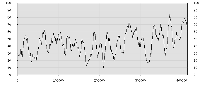 (по горизонтали: счётчик знаков; по вертикали: процент диалогов; размер скользящего окна: знаков, шаг: 1000 знаков) |