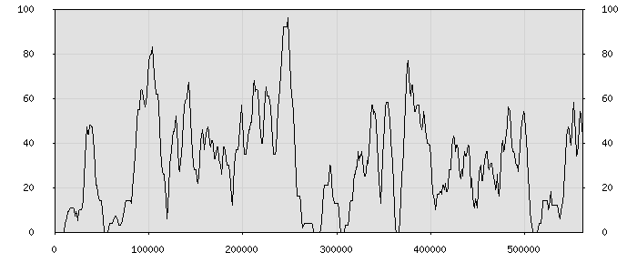 (по горизонтали: счётчик знаков; по вертикали: процент диалогов; размер скользящего окна: знаков, шаг: 1000 знаков) |