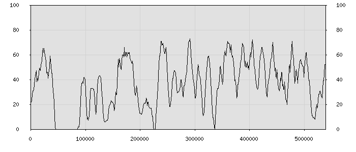 (по горизонтали: счётчик знаков; по вертикали: процент диалогов; размер скользящего окна: знаков, шаг: 1000 знаков) |