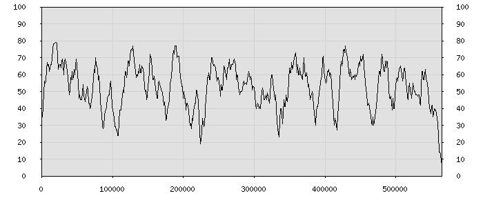 (по горизонтали: счётчик знаков; по вертикали: процент диалогов; размер скользящего окна: знаков, шаг: 1000 знаков) |