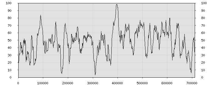 (по горизонтали: счётчик знаков; по вертикали: процент диалогов; размер скользящего окна: знаков, шаг: 1000 знаков) |