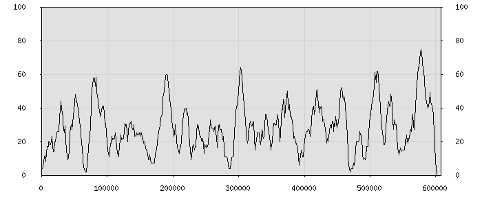 (по горизонтали: счётчик знаков; по вертикали: процент диалогов; размер скользящего окна: знаков, шаг: 1000 знаков) |
