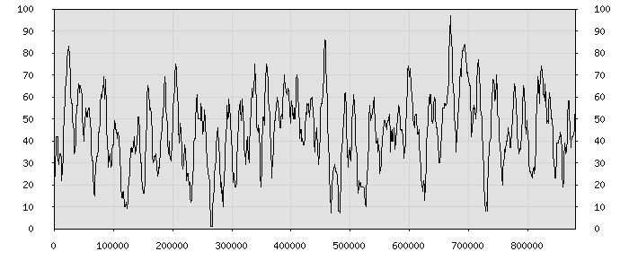 (по горизонтали: счётчик знаков; по вертикали: процент диалогов; размер скользящего окна: знаков, шаг: 1000 знаков) |
