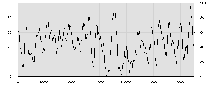 (по горизонтали: счётчик знаков; по вертикали: процент диалогов; размер скользящего окна: знаков, шаг: 1000 знаков) |