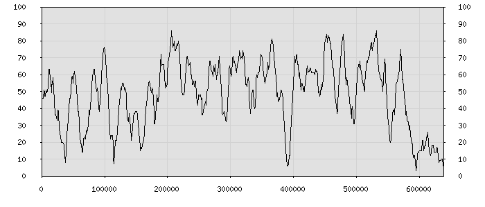 (по горизонтали: счётчик знаков; по вертикали: процент диалогов; размер скользящего окна: знаков, шаг: 1000 знаков) |