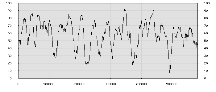 (по горизонтали: счётчик знаков; по вертикали: процент диалогов; размер скользящего окна: знаков, шаг: 1000 знаков) |