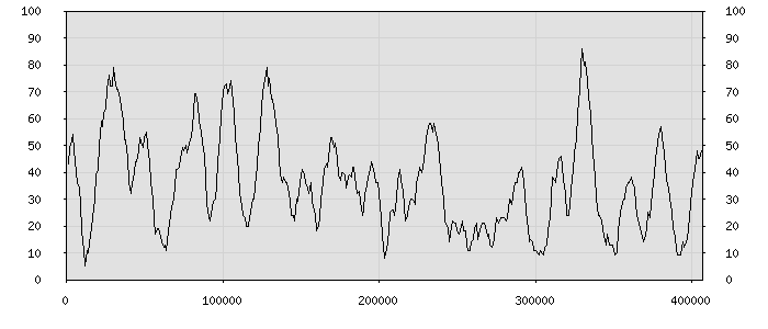 (по горизонтали: счётчик знаков; по вертикали: процент диалогов; размер скользящего окна: знаков, шаг: 1000 знаков) |