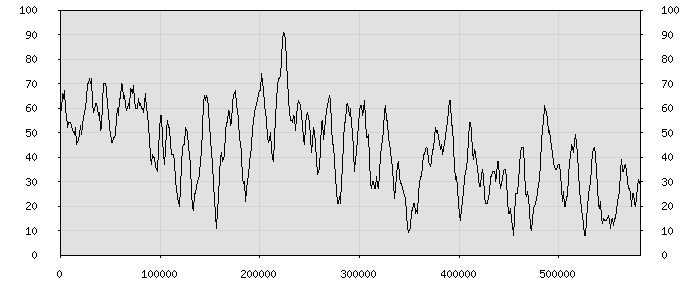 (по горизонтали: счётчик знаков; по вертикали: процент диалогов; размер скользящего окна: знаков, шаг: 1000 знаков) |