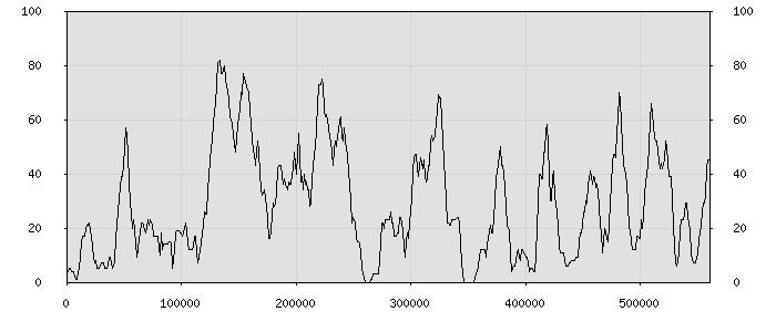 (по горизонтали: счётчик знаков; по вертикали: процент диалогов; размер скользящего окна: знаков, шаг: 1000 знаков) |