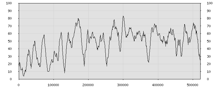 (по горизонтали: счётчик знаков; по вертикали: процент диалогов; размер скользящего окна: знаков, шаг: 1000 знаков) |