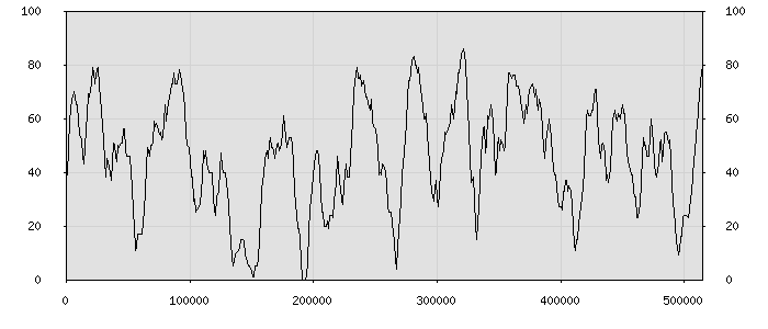 (по горизонтали: счётчик знаков; по вертикали: процент диалогов; размер скользящего окна: знаков, шаг: 1000 знаков) |