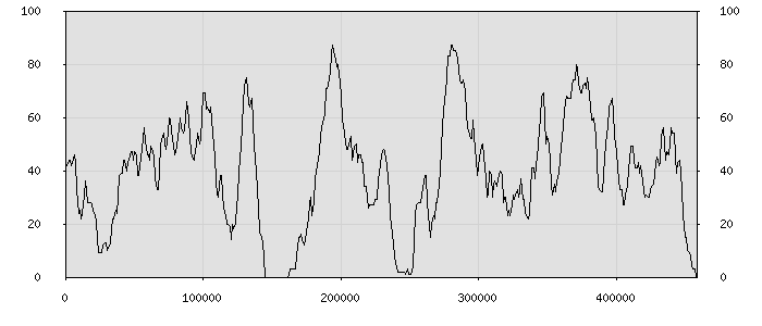 (по горизонтали: счётчик знаков; по вертикали: процент диалогов; размер скользящего окна: знаков, шаг: 1000 знаков) |