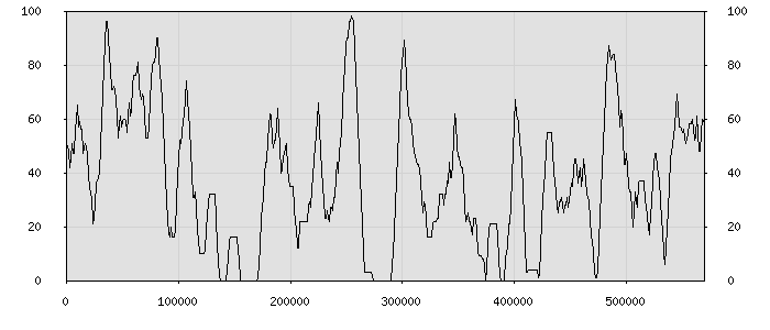 (по горизонтали: счётчик знаков; по вертикали: процент диалогов; размер скользящего окна: знаков, шаг: 1000 знаков) |