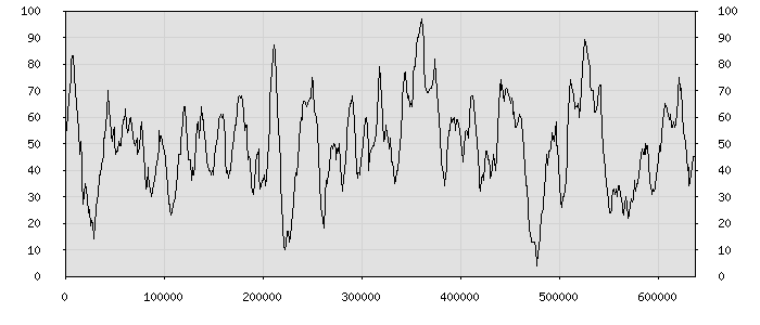 (по горизонтали: счётчик знаков; по вертикали: процент диалогов; размер скользящего окна: знаков, шаг: 1000 знаков) |