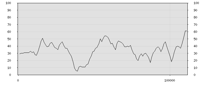 (по горизонтали: счётчик знаков; по вертикали: процент диалогов; размер скользящего окна: знаков, шаг: 1000 знаков) |