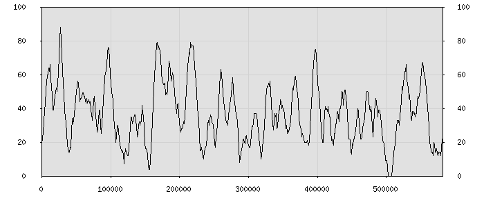 (по горизонтали: счётчик знаков; по вертикали: процент диалогов; размер скользящего окна: знаков, шаг: 1000 знаков) |