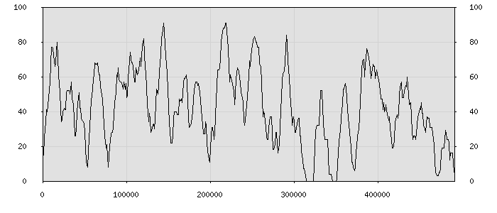 (по горизонтали: счётчик знаков; по вертикали: процент диалогов; размер скользящего окна: знаков, шаг: 1000 знаков) |