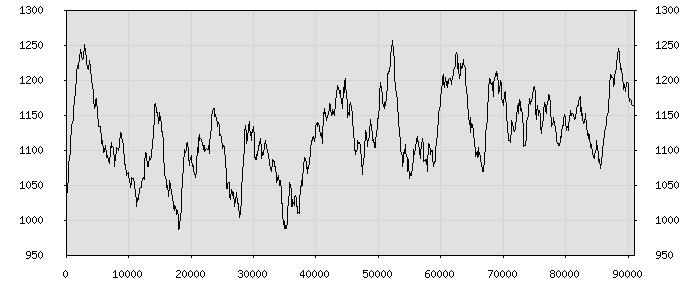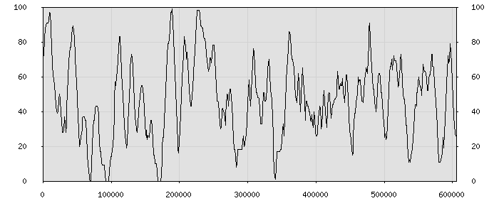 (по горизонтали: счётчик знаков; по вертикали: процент диалогов; размер скользящего окна: знаков, шаг: 1000 знаков) |