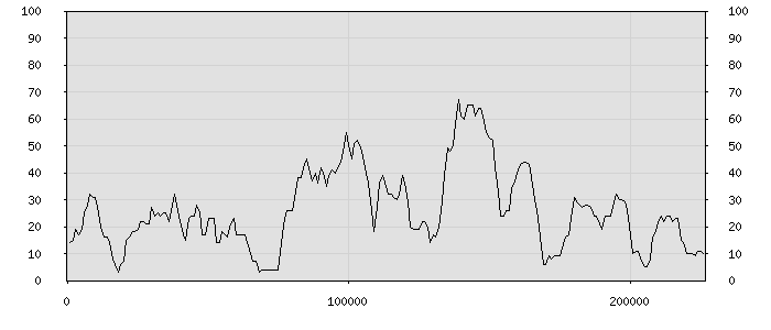 (по горизонтали: счётчик знаков; по вертикали: процент диалогов; размер скользящего окна: знаков, шаг: 1000 знаков) |