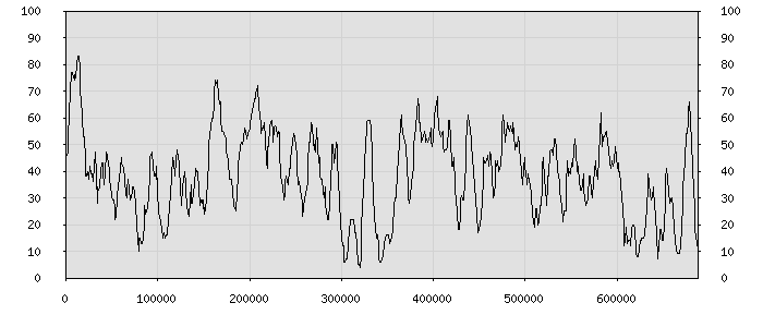 (по горизонтали: счётчик знаков; по вертикали: процент диалогов; размер скользящего окна: знаков, шаг: 1000 знаков) |